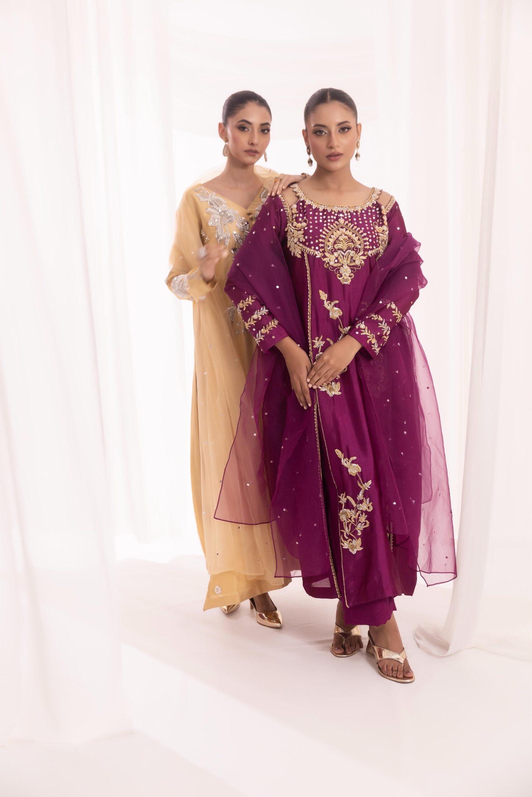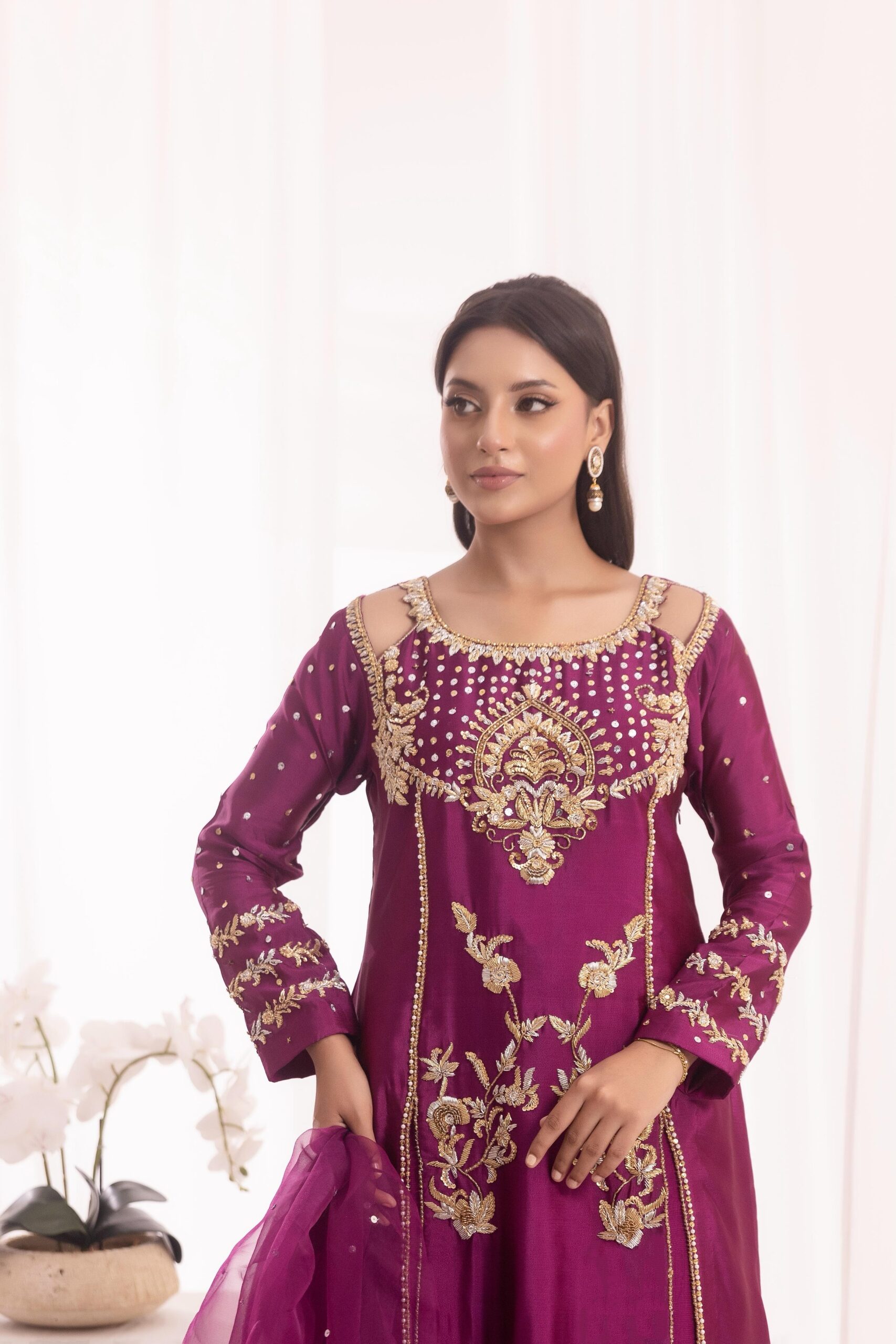 💜 : A majestic plum outfit, adorned with heavy golden embroidery and delicate pearl-like detailing across the neckline, paired with a sheer dupatta sprinkled with embellishments. The bold cutout shoulders add a modern flair, making it a statement piece for evening soirées and wedding festivities.