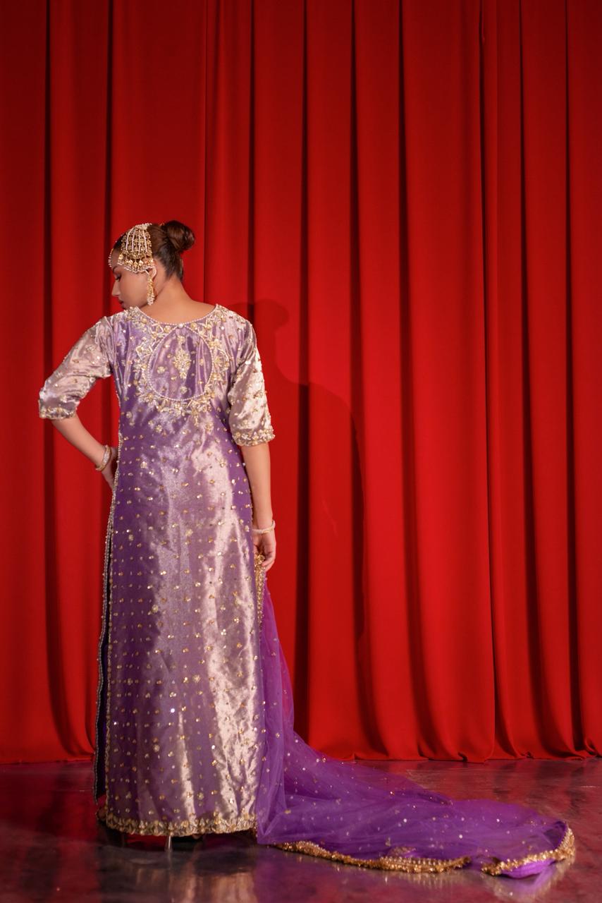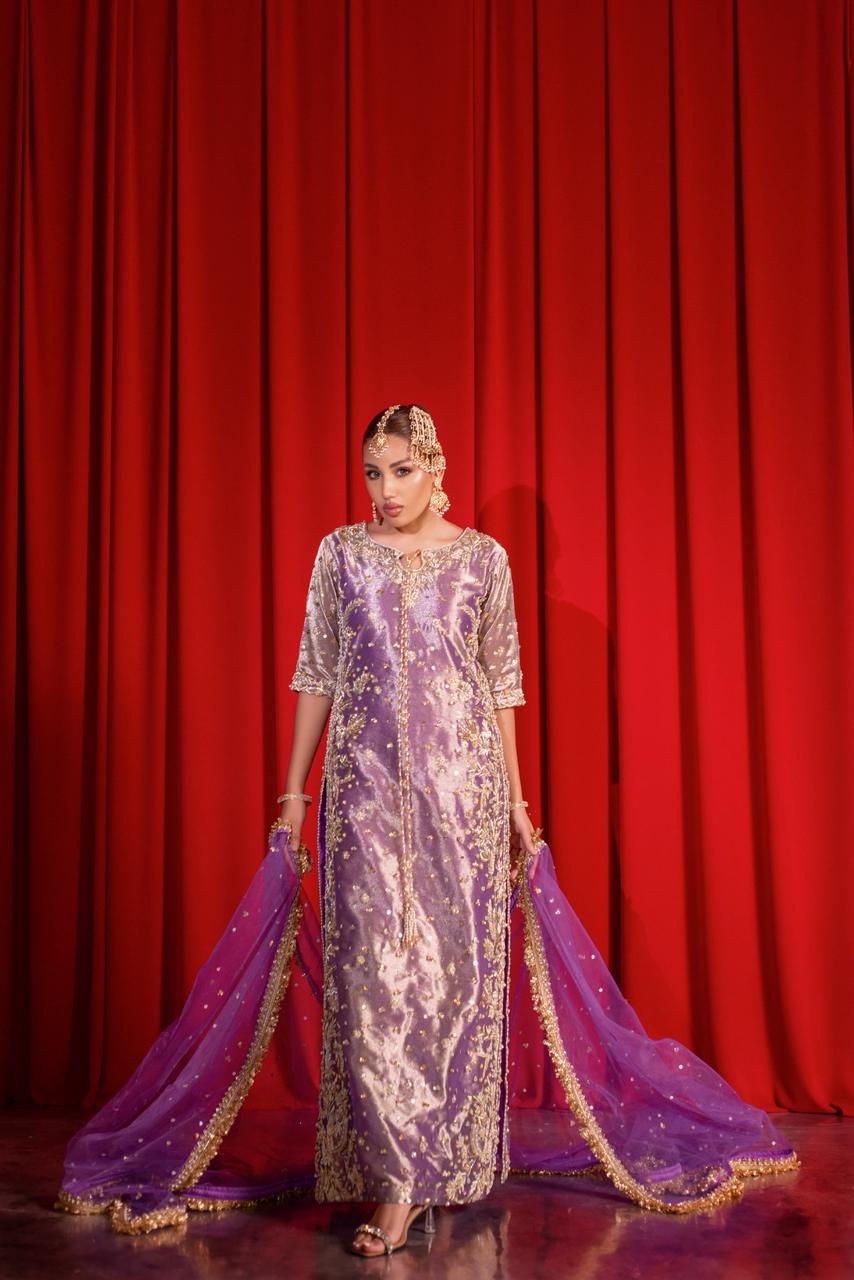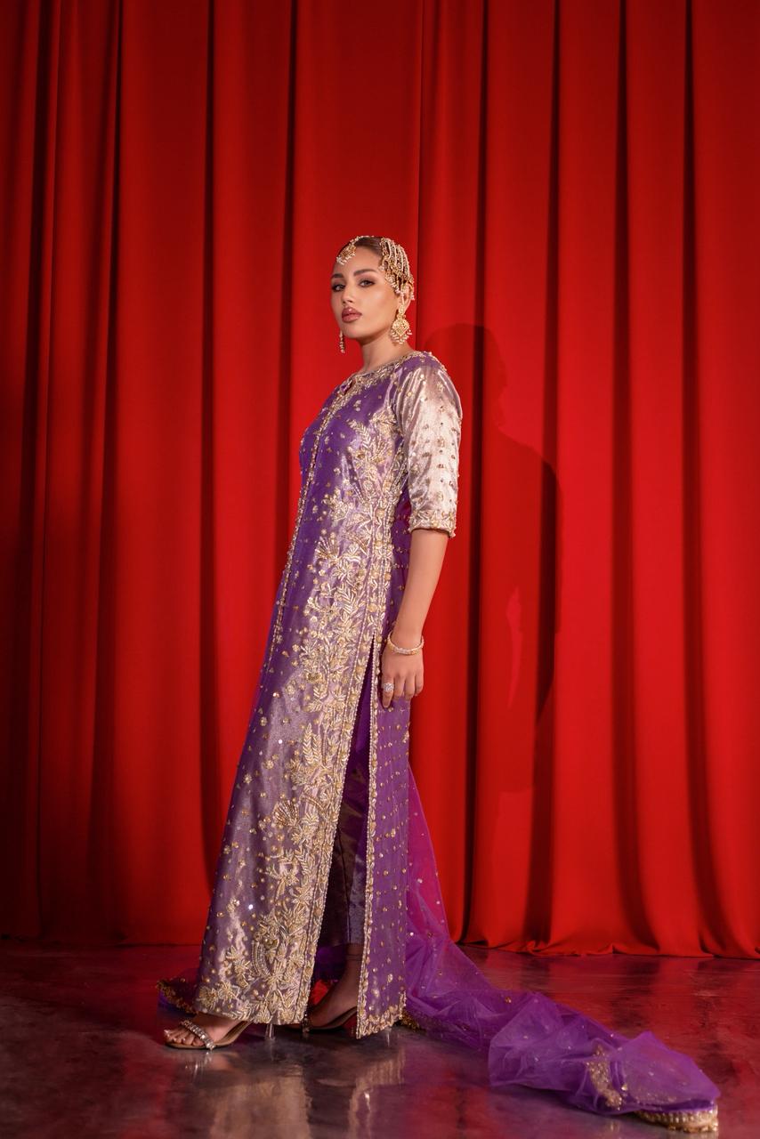 An ode to timeless elegance, this silhouette is drenched in hand-crafted gold embroidery that blooms softly over a rich purple canvas. Designed with a sleek front slit and paired with a sheer, flowing dupatta, the look moves like poetry with every step.