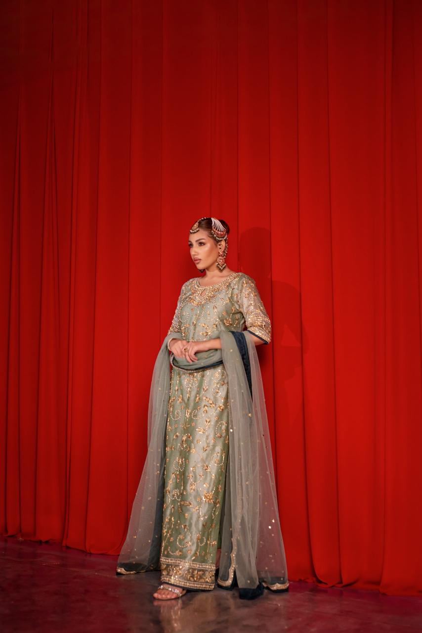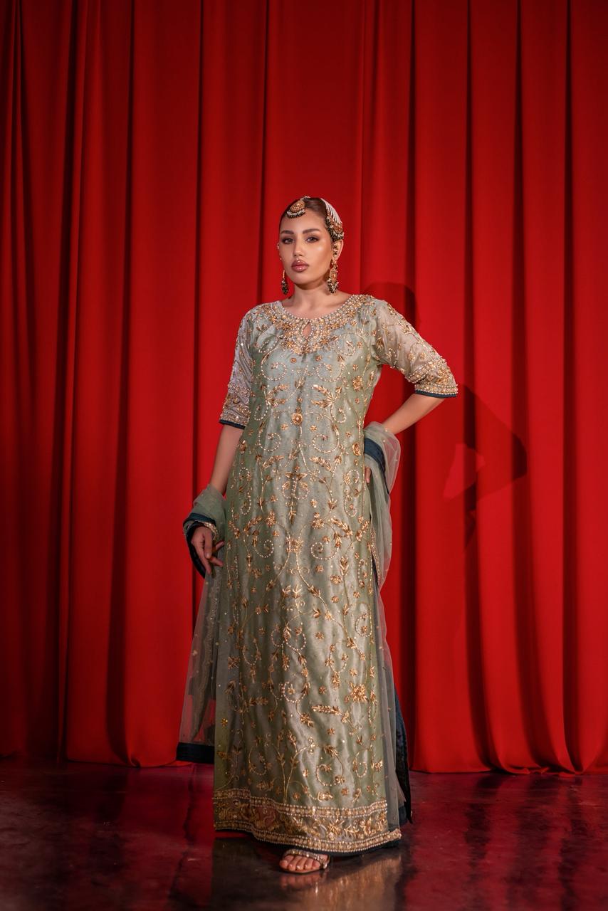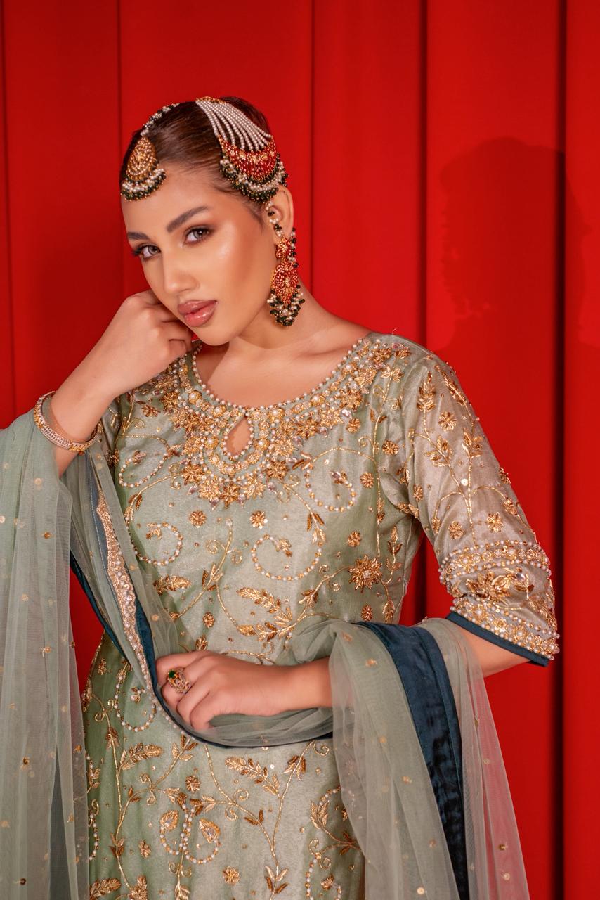 A sage green silhouette brought to life with intricate gold handwork — every motif whispering tales of old-world craftsmanship and timeless grace. ✨