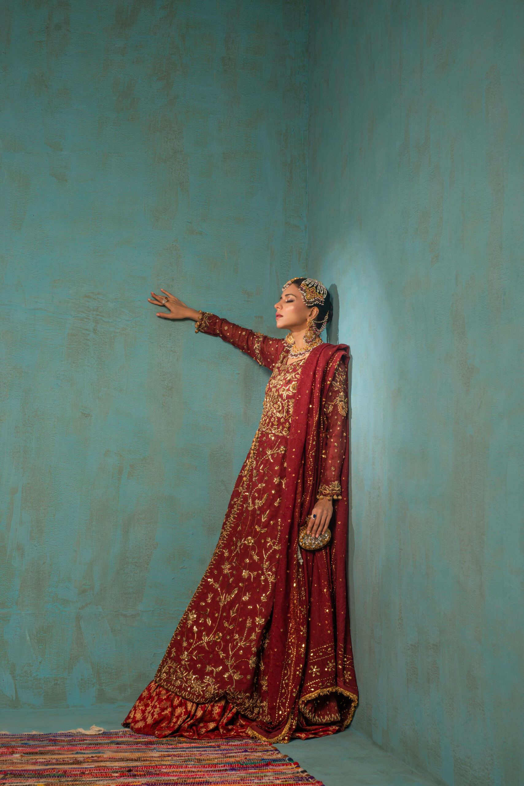 Draped in deep maroon cotton net, this exquisite ensemble is a celebration of heritage and elegance. Intricately hand-embroidered with antique gold zari, tilla, and resham, the outfit reflects the grandeur of classic craftsmanship. The flared silhouette features delicate floral vines cascading throughout, while the hem and sleeves are accentuated with richly detailed borders. Paired with a matching dupatta adorned with scattered motifs and scalloped edges, this look is perfect for a bride who cherishes old-world charm. Styled with traditional kundan jewelry and a graceful posture, the look is completed with understated poise and timeless beauty