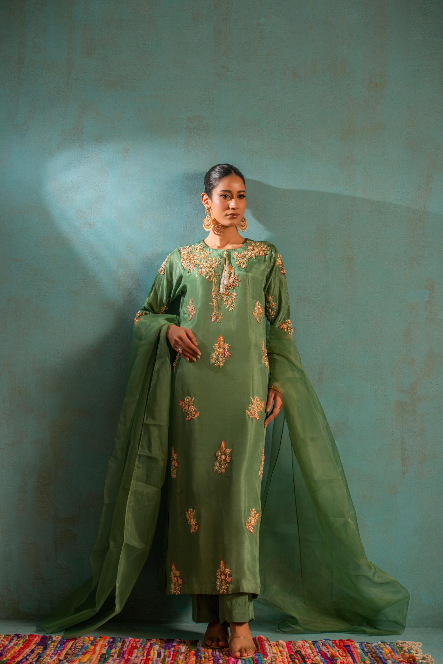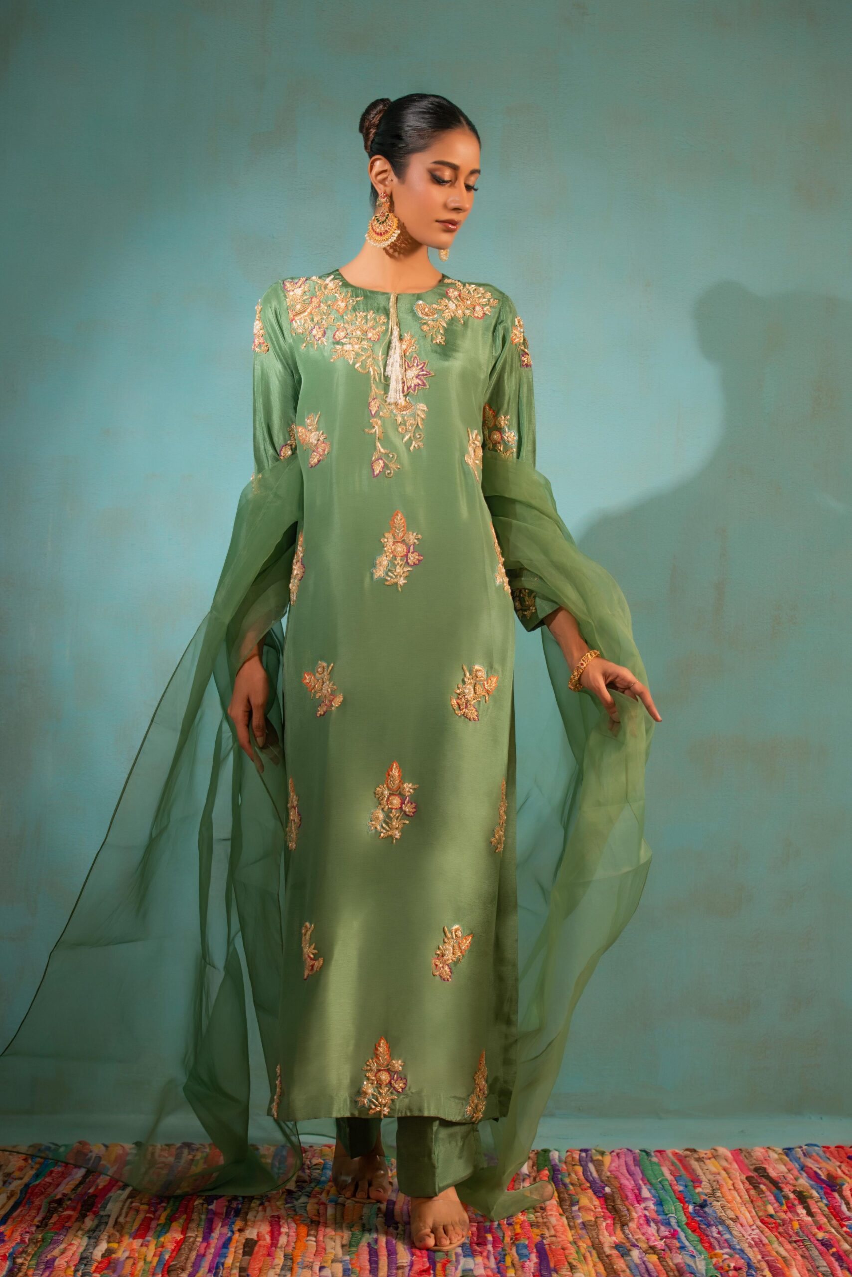 Draped in an enchanting shade of sage green, this ensemble is a refined blend of tradition and elegance. Crafted on lustrous silk, the straight-cut silhouette is elevated with intricate resham and zardozi embroidery in soft golds and peaches, forming floral clusters that bloom across the neckline, sleeves, and hem. The organza dupatta flows effortlessly, adding a hint of ethereal charm. Perfect for intimate festivities or graceful soirées, this look exudes effortless sophistication.